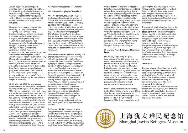 The core mission of the Shanghai Jewish Refugees Museum is to remember this special history, fill the gap of "salvation stories in the East" in the narrative of World War II, and serves as a profound historical example for building a community with a shared future for humanity. This radiance of humanitarianism that transcends national borders and ethnic groups, like a torch in the long night, not only has illuminated the past, but also will guide humanity toward a future of peace, inclusiveness and shared prosperity.