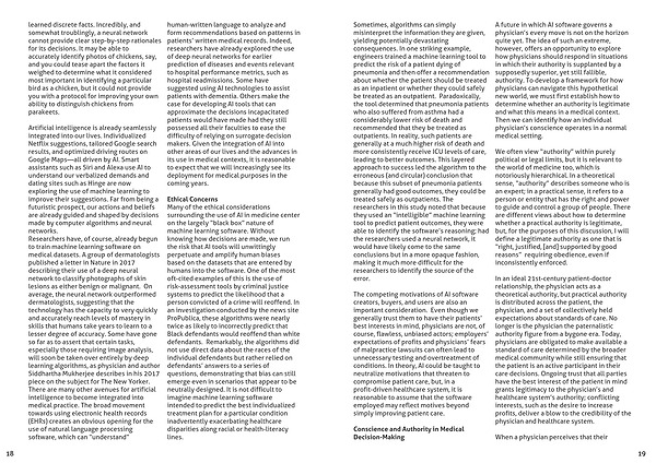 There are many other avenues for artificial intelligence to become integrated into medical practice. The broad movement towards using electronic health records (EHRs) creates an obvious opening for the use of natural language processing software, which can “understand” human-written language to analyze and form recommendations based on patterns in patients’ written medical records. Indeed, researchers have already explored the use of deep neural networks for earlier prediction of diseases and events relevant to hospital performance metrics, such as hospital readmissions. Some have suggested using AI technologies to assist patients with dementia. Others make the case for developing AI tools that can approximate the decisions incapacitated patients would have made had they still possessed all their faculties to ease the difficulty of relying on surrogate decision makers. Given the integration of AI into other areas of our lives and the advances in its use in medical contexts, it is reasonable to expect that we will increasingly see its deployment for medical purposes in the coming years.