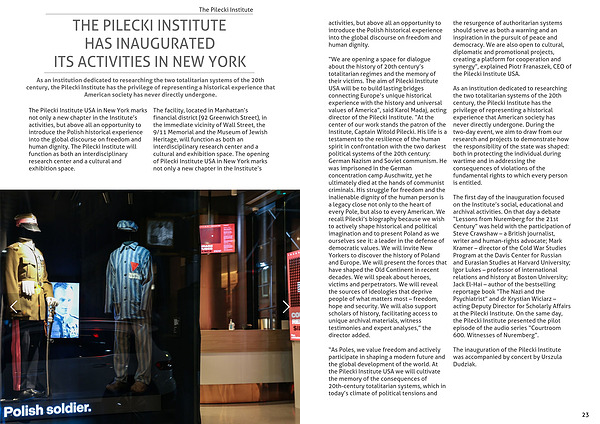 “We are opening a space for dialogue about the history of 20th century’s totalitarian regimes and the memory of their victims. The aim of Pilecki Institute USA will be to build lasting bridges connecting Europe’s unique historical experience with the history and universal values of America”, said Karol Madaj, acting director of the Pilecki Institute. “At the center of our work stands the patron of the Institute, Captain Witold Pilecki. His life is a testament to the resilience of the human spirit in confrontation with the two darkest political systems of the 20th century: German Nazism and Soviet communism. He was imprisoned in the German concentration camp Auschwitz, yet he ultimately died at the hands of communist criminals. His struggle for freedom and the inalienable dignity of the human person is a legacy close not only to the heart of every Pole, but also to every American. We recall Pilecki’s biography because we wish to actively shape historical and political imagination and to present Poland as we ourselves see it: a leader in the defense of democratic values. We will invite New Yorkers to discover the history of Poland and Europe. We will present the forces that have shaped the Old Continent in recent decades. We will speak about heroes, victims and perpetrators. We will reveal the sources of ideologies that deprive people of what matters most – freedom, hope and security. We will also support scholars of history, facilitating access to unique archival materials, witness testimonies and expert analyses,” the director added.