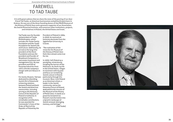 It is with great sadness that we share the news of the passing of our dear friend Tad Taube, an American businessman and philanthropist born in Krakow. He was one of the three founding donors of the POLIN Museum of the History of Polish Jews and a generous supporter of our Association, the Jewish Historical Institute, and numerous other institutions, projects, and initiatives in Poland, the United States and Israel.