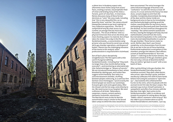 13. See the photograph accompanying the article cited here; that proximity between the camera and actor is very challenging, and heavily contributes to the film’s feel. Gregg Kilday, “How ‘Son of Saul’ Defied the Dangers of Re-Creating the Holocaust”, The Hollywood Reporter, November 16, 2015.