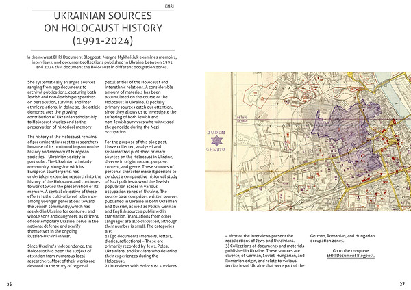 The history of the Holocaust remains of preeminent interest to researchers because of its profound impact on the history and memory of European societies – Ukrainian society in particular. The Ukrainian scholarly community, alongside with its European counterparts, has undertaken extensive research into the history of the Holocaust and continues to work toward the preservation of its memory. A central objective of these efforts is the cultivation of tolerance among younger generations toward the Jewish community, which has resided in Ukraine for centuries and whose sons and daughters, as citizens of contemporary Ukraine, serve in the national defense and scarify themselves in the ongoing Russian-Ukrainian War.