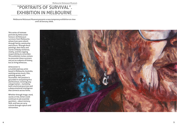 This series of intimate portraits by Anita Lester honours 16 Holocaust survivors from Melbourne, whose lives were rebuilt through family, community and culture. Through these paintings, their faces and stories embody resilience, vitality, and the ongoing responsibility to remember. This exhibition invites visitors to encounter these survivors not just as subjects of history, but as living witnesses.