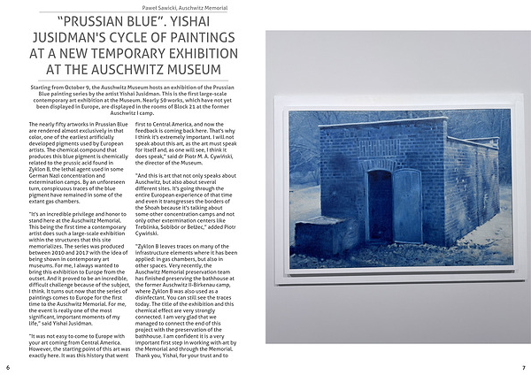 “Zyklon B leaves traces on many of the infrastructure elements where it has been applied: in gas chambers, but also in other spaces. Very recently, the Auschwitz Memorial preservation team has finished preserving the bathhouse at the former Auschwitz II-Birkenau camp, where Zyklon B was also used as a disinfectant. You can still see the traces today. The title of the exhibition and this chemical effect are very strongly connected. I am very glad that we managed to connect the end of this project with the preservation of the bathhouse. I am confident it is a very important first step in working with art by the Memorial and through the Memorial. Thank you, Yishai, for your trust and to