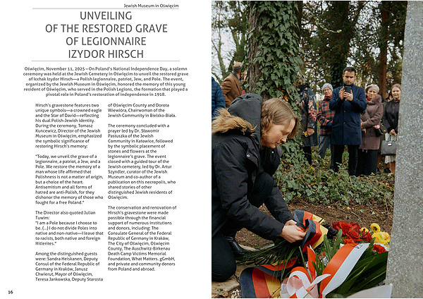 The conservation and renovation of Hirsch’s gravestone were made possible through the financial support of numerous institutions and donors, including: The Consulate General of the Federal Republic of Germany in Kraków, The City of Oświęcim, Oświęcim County, The Auschwitz-Birkenau Death Camp Victims Memorial Foundation, What Matters. gGmbH, and private and community donors from Poland and abroad.
