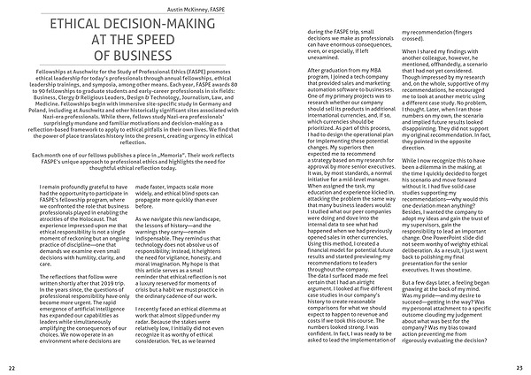 Fellowships at Auschwitz for the Study of Professional Ethics (FASPE) promotes ethical leadership for today’s professionals through annual fellowships, ethical leadership trainings, and symposia, among other means. Each year, FASPE awards 80 to 90 fellowships to graduate students and early-career professionals in six fields: Business, Clergy & Religious Leaders, Design & Technology, Journalism, Law, and Medicine. Fellowships begin with immersive site-specific study in Germany and Poland, including at Auschwitz and other historically significant sites associated with Nazi-era professionals. While there, fellows study Nazi-era professionals’ surprisingly mundane and familiar motivations and decision-making as a reflection-based framework to apply to ethical pitfalls in their own lives. We find that the power of place translates history into the present, creating urgency in ethical reflection.