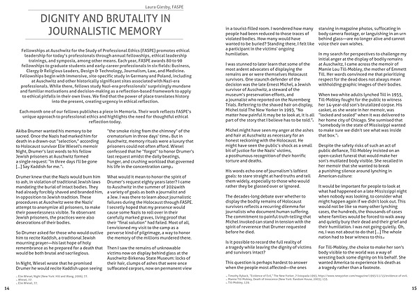 Fellowships at Auschwitz for the Study of Professional Ethics (FASPE) promotes ethical leadership for today’s professionals through annual fellowships, ethical leadership trainings, and symposia, among other means. Each year, FASPE awards 80 to 90 fellowships to graduate students and early-career professionals in six fields: Business, Clergy & Religious Leaders, Design & Technology, Journalism, Law, and Medicine. Fellowships begin with immersive, site-specific study in Germany and Poland, including at Auschwitz and other historically significant sites associated with Nazi-era professionals. While there, fellows study Nazi-era professionals’ surprisingly mundane and familiar motivations and decision-making as a reflection-based framework to apply to ethical pitfalls in their own lives. We find that the power of place translates history into the present, creating urgency in ethical reflection.