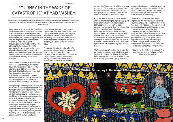 “Yad Vashem holds one of the world’s most significant collections of Holocaust-era art — works that were often the final expressions of Jews before they were murdered. With Tal’s exhibition, we see how that legacy continues to evolve. Her work speaks powerfully to this generation’s anguish while honoring the memory of another. Through these canvases, we witness the transmission of collective pain — and the resilience that springs from it.”