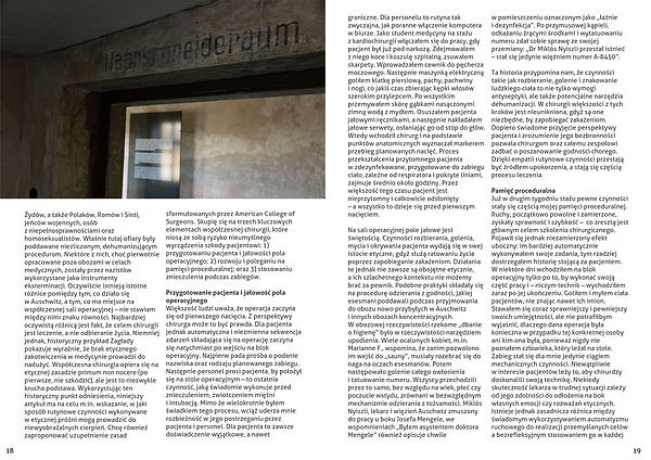 w Auschwitz, a tym, co ma miejsce na współczesnej sali operacyjnej – nie stawiam między nimi znaku równości. Najbardziej oczywistą różnicą jest fakt, że celem chirurgii jest leczenie, a nie odbieranie życia. Niemniej jednak, historyczny przykład Zagłady pokazuje wyraźnie, że brak etycznego zakotwiczenia w medycynie prowadzi do nadużyć. Współczesna chirurgia opiera się na etycznej zasadzie primum non nocere (po pierwsze, nie szkodzić), ale jest to niezwykle krucha podstawa. Wykorzystując ten historyczny punkt odniesienia, niniejszy artykuł ma na celu m.in. wskazanie, w jaki sposób rutynowe czynności wykonywane