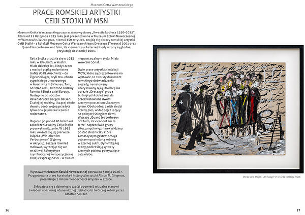 Muzeum Getta Warszawskiego zaprasza na wystawę „Kwestia kobieca 1550–2025”, która od 21 listopada 2025 roku jest prezentowana w Muzeum Sztuki Nowoczesnej w Warszawie. Wśród prac, niemal 150 artystek, znajdą się obrazy romskiej artystki Ceiji Stojki – z kolekcji Muzeum Getta Warszawskiego: Dressage (Tresura) 2001 oraz Quand les corbeaux ont faim, ils viennent sur la terre (Kiedy wrony są głodne, przylatują na ziemię) 2001.