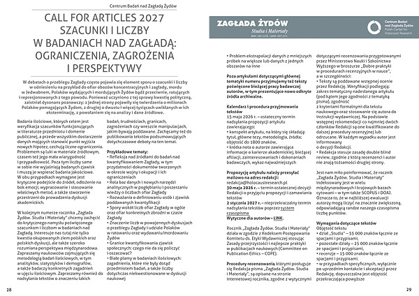 W kolejnym numerze rocznika „Zagłada Żydów. Studia i Materiały” chcemy zachęcić do krytycznego namysłu poświęconego szacunkom i liczbom w badaniach nad Zagładą. Interesuje nas tutaj nie tylko kwestia okupowanych ziem polskich oraz polskich dyskusji, ale także szeroko rozumiana perspektywa międzynarodowa. Zapraszamy naukowców zajmujących się metodologią badań ilościowych, w tym analityków, statystyków i demografów,