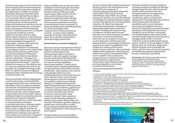 w medycynie będzie wymagało nieustannego dialogu między lekarzami, administratorami systemu ochrony zdrowia i twórcami oprogramowania na temat legitymizacji autorytetu AI. Czy jest on „słuszny, uzasadniony i oparty na racjonalnych przesłankach”? Czy nadal będziemy oczekiwać od lekarzy zachowania określonych standardów opieki, czy też zostaną one poluzowane, jeśli algorytm uzna to za stosowne? Czy praktyczny autorytet pewnego dnia będzie należał wyłącznie do sztucznej inteligencji, czy też AI stanie się po prostu równorzędnym głosem obok innych źródeł autorytetu medycznego? Z pewnością musimy wyciągnąć lekcję z historii i stworzyć środowisko, w którym podejmowanie decyzji zgodnie z ludzkim sumieniem będzie nie tylko dopuszczalne, ale i wspierane. Droga usłana dobrymi chęciami nie musi prowadzić do piekła – pod warunkiem, że zostanie wytyczona ze świadomością zagrożeń i będziemy nią kroczyć z najwyższą z ostrożnością.