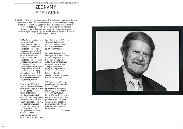 Z wielkim bólem przyjęliśmy wiadomość o śmierci naszego wspaniałego przyjaciela Tada Taube – urodzonego w Krakowie amerykańskiego biznesmena i filantropa, jednego z trzech Darczyńców Założycieli Muzeum Historii Żydów Polskich POLIN, darczyńcę naszego Stowarzyszenia, Żydowskiego Instytutu Historycznego oraz niezliczonych, instytucji, projektów i inicjatyw w Polsce, Stanach Zjednoczonych i Izraelu.