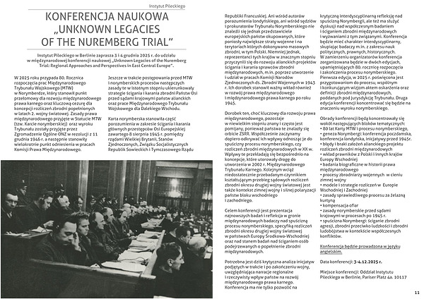 Celem konferencji jest prezentacja najnowszych badań i refleksja w gronie międzynarodowych badaczy nad spuścizną procesu norymberskiego, specyfiką rozliczeń zbrodni okresu drugiej wojny światowej