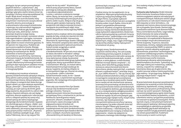 Strefa interesów Jonathana Glazera to pod wieloma względami odejście od tradycyjnych rozwiązań kinowych. Fabuła jest celowo uboga w porównaniu ze 126 rolami mówionymi i 30 000 statystów w Liście Schindlera21; nie pokazuje nam horroru obozu koncentracyjnego, jak w przypadku Syna Szawła. Zamiast tego przedstawia codzienne życie domowe Rudolfa Hössa, komendanta Auschwitz, i jego rodziny. Strefa interesów nie owija w bawełnę. Fachowcy, koniec końców, są po prostu fachowcami. Ich współudział w Holokauście (jak w każdym innym okrucieństwie) jest niemal oczywisty. Ta ponura, rzeczowa interpretacja, niestety, najlepiej odzwierciedla wnioski z naszej podróży FASPE: to właśnie ogromny i niemal całkowity współudział biznesmenów, prawników i technologów leżał