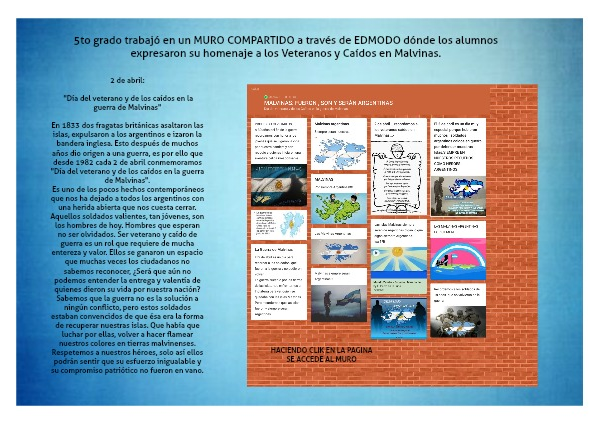 5to grado trabajó en un MURO COMPARTIDO a través de EDMODO dónde los alumnos expresaron su homenaje a los Veteranos y Caídos en Malvinas.