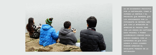es en escenarios provistos por la naturaleza, como si supiera la ventaja y el provecho que brindan, que los apasionados por la fotografía se reúnen, más que con la intención de apreciar el paisaje, sino con las ansias de capturar esos pasajes, y poder llevárselos consigo hacia nuevos rumbos, con la esperanza de que ojos ajenos a esos lugares puedan apreciar el excelente trabajo de la naturaleza.