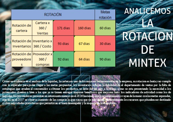 Como se evidencia en el analisis de la liquidez, la cartera es uno de los mayores inconvenientes en la empresa, su rotacion es lenta y no cumple con lo esperado para poder llegar a las metas propuestas, los inventarios reflejan la debilidad en el departamento de ventas por la falta de estrategias que ayuden al consumidor a obtener los productos, se debe dar un giro a la forma como se esta presentando la necesidad a los potenciales clientes o bien a los que ya se tienen entregar mayores beneficios que mejoren tanto los indicadores de actividad como los de liquidez, los proveedores presentan un interesante manejo en el 2016 haciendo que los cumplimientos vayan de la mano con las metas esperadas, aun asi en el 2017 se observa aumento de las compras lo que causa que se este usando frcuentemente los recursos que póueden ser destinado a otras actividades prioritarias que permitirian el buen desempeño y la mejoria de los resultado.