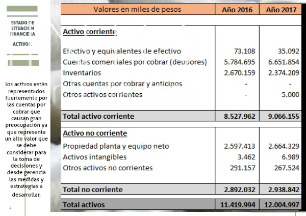 los activos están representados fuertemente por las cuentas por cobrar que causan gran preocupación ya que representa un alto valor que se debe considerar para la toma de decisiones y desde gerencia las medidas y estrategias a desarrollar.