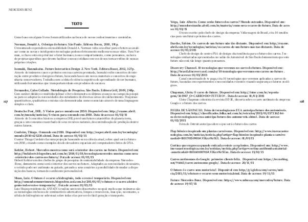 Kohler, Hebert. Mercedes mostra como será o interior dos carros no futuro. Disponível em: http:// bufalostv. blogosfera. uol. com. br / 2014 / 11 / 18 / tecnologia-mercedes-mostra-como-sera--o-interior-dos-carros-no-futuro /. Data de acesso: 01 / 03 / 15 Hebert Kohler um dos chefes do grupo de pesquisa de sustentabilidade da empresa Mercedes--Benz, demonstra como será o interior dos carros no futuro. Adaptados as necessidades do usuário, o veículo pode ser autômato ou guiado, gerando a seus usuários a possibilidade de mudar a disposição dos bancos, tornando o ambiente personalizável.