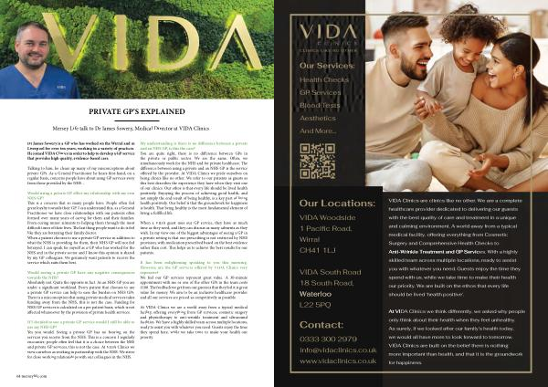 VIDA Clinics are clinics like no other . We are a complete healthcare provider dedicated to delivering our guests with the best quality of care and treatment in a unique and calming environment . A world away from a typical medical facility , offering everything from Cosmetic Surgery and Comprehensive Health Checks to Anti-Wrinkle Treatment and GP Services . With a highly skilled team across multiple locations , ready to assist you with whatever you need . Guests enjoy the time they spend with us , while we take time to make their health our priority . We are built on the ethos that every life should be lived ‘ health positive ’.
