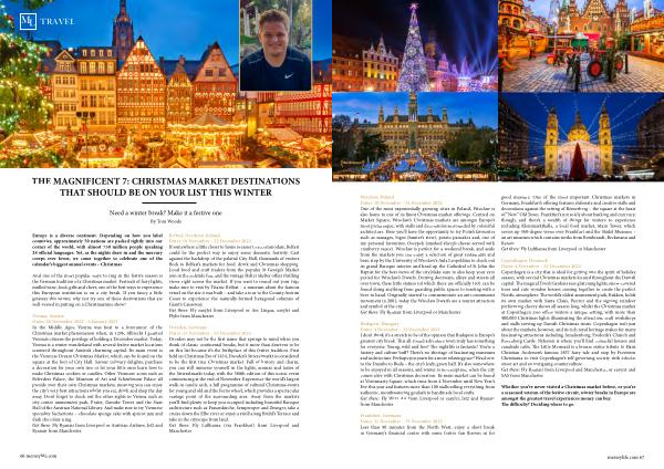 Vienna , Austria Dates : 20 November 2022 – 4 January 2023 In the Middle Ages , Vienna was host to a forerunner of the Christmas market phenomenon when , in 1296 , Albrecht I granted Vienna ’ s citizens the privilege of holding a December market . Today , Vienna is a winter wonderland with several festive market locations scattered throughout Austria ’ s charming capital . Its main event is the Viennese Dream Christmas Market , which can be found on the square at the foot of City Hall . Savour culinary delights , purchase a decoration for your own tree or let your little ones learn how to make Christmas cookies or candles . Other Viennese icons such as Belvedere Palace , the Museum of Art and Schönbrunn Palace all preside over their own Christmas markets , meaning you can enjoy the city ’ s very best attractions whilst you eat , drink and shop the day away . Don ’ t forget to check out the other sights in Vienna such as city centre amusement park , Prater , Danube Tower and the State Hall of the Austrian National Library . And make sure to try Viennese speciality Sachertorte – chocolate sponge cake with apricot jam and dark chocolate icing . Get there : Fly Ryanair from Liverpool or Austrian Airlines , Jet2 and Ryanair from Manchester .
