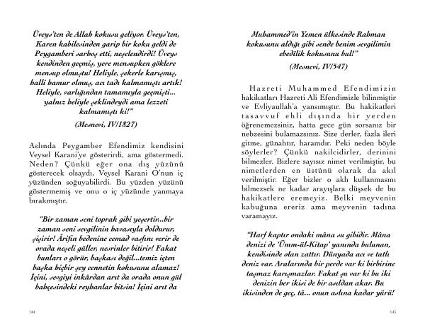 H a z r e t i M u h a m m e d E f e n d i m i z i n hakikatları Hazreti Ali Efendimizle bilinmiştir ve Evliyaullah ’ a yansımıştır . Bu hakikatleri t a s a v v u f e h l i d ı ş ı n d a b i r y e r d e n öğrenemezsiniz , hatta gece gün sorsanız bir nebzesini bulamazsınız . Size derler , fazla ileri gitme , günahtır , haramdır . Peki neden böyle söylerler ? Çünkü nakilcidirler , derinini bilmezler . Bizlere sayısız nimet verilmiştir , bu nimetlerden en üstünü olarak da akıl verilmiştir . Eğer bizler o aklı kullanmasını bilmezsek ne kadar arayışlara düşsek de bu hakikatlere eremeyiz . Belki meyvenin kabuğuna ereriz ama meyvenin tadına varamayız .