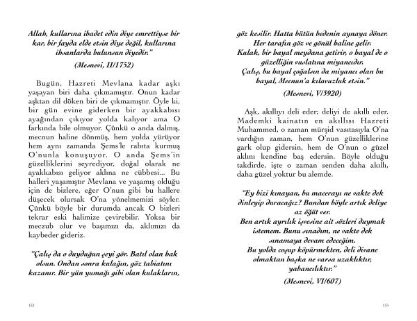 Bugün , Hazreti Mevlana kadar aşkı yaşayan biri daha çıkmamıştır . Onun kadar aşktan dil döken biri de çıkmamıştır . Öyle ki , bir gün evine giderken bir ayakkabısı ayağından çıkıyor yolda kalıyor ama O farkında bile olmuyor . Çünkü o anda dalmış , mecnun haline dönmüş , hem yolda yürüyor hem aynı zamanda Şems ’ le rabıta kurmuş O ’ nunla konuşuyor . O anda Şems ’ in güzelliklerini seyrediyor , doğal olarak ne ayakkabısı geliyor aklına ne cübbesi ... Bu halleri yaşamıştır Mevlana ve yaşamış olduğu için de bizlere , eğer O ’ nun gibi bu hallere düşecek olursak O ’ na yönelmemizi söyler . Çünkü böyle bir durumda ancak O bizleri tekrar eski halimize çevirebilir . Yoksa bir meczub olur ve başımızı da , aklımızı da kaybeder gideriz .