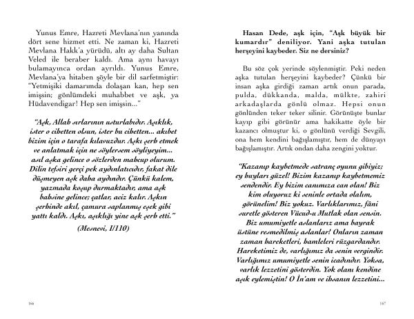 “ Kazanıp kaybetmede satranç oyunu gibiyiz ; ey huyları güzel ! Bizim kazanıp kaybetmemiz sendendir . Ey bizim canımıza can olan ! Biz kim oluyoruz ki seninle ortada olalım , görünelim ! Biz yokuz . Varlıklarımız , fâni suretle gösteren Vücud-u Mutlak olan sensin . Biz umumiyetle aslanlarız ama bayrak üstüne resmedilmiş aslanlar ! Onların zaman zaman hareketleri , hamleleri rüzgardandır . Hareketimiz de , varlığımız da senin vergindir . Varlığımız umumiyetle senin icadındır . Yoksa , varlık lezzetini gösterdin . Yok olanı kendine aşık eylemiştin ! O İn ’ am ve ihsanın lezzetini ...