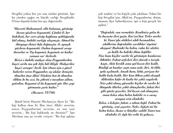 “ Hazreti Muhammed , elde bulunan , görünüp duran yüzlerce kıyametti . Çünkü O , her hakikati , her sırrı çözüp bağlama yokluğunda hâl olmuş , hakiki varlığa ulaşmıştı . Ahmed bu dünyaya ikinci defa doğmuştu . O , apaçık yüzlerce kıyametti . Ondan kıyameti sorup dururlar ve ‘ Ey kıyamet , kıyamete ne kadar zaman var ’ derlerdi . Birisi o hakiki mahşer olan Peygamberden haşri sordu mu çok defa hâl diliyle ‘ Mahşerden haşri soruyor ’ derdi . İşte Onun için o güzel haberler veren Peygamber , ey ulular demiştir , ölmeden önce ölün ! Nitekim ben de ölmeden öldüm de bu sesi , bu şöhreti o taraftan aldım , getirdim . Kıyamet ol da kıyameti gör . Her şeyi görmenin şartı budur .”