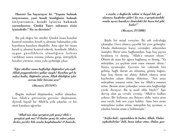 Şöyle bir misal vereyim : İki atlı yolculuğa çıkmışlar . Gece olunca çayırlık bir yere gelmişler . Orada dinlenmeye karar vermişler , atlarından inmişler . Birisi atını bağlamadan , başı boş çayıra bırakmış ve demiş , “ Allah ’ a emanet olsun .” Öbürü de atını bir ağaca bağlamış ve demiş , “ Ya mürşidim , ya şeyhim atım sana emanet olsun .” Sonra uyumuşlar . Gecenin bir vaktinde biri gelmiş , bağlı duran atı almamış , gitmiş bağsız , başı boş duran atı almış . Sabah olunca atını kaybeden adam dönüp öbürüne , “ Sen atını mürşidine emanet ettin , ben ise Allah ’ a emanet ettim . Benim atımı çalmışlar , senin atın bağlandığı yerde duruyor . Bu iş nasıl oldu böyle ?” İşte derviş olan şu cevabı vermiş : “ Allah ’ ın kulları çoktur . Bir kulunun ata ihtiyacı oldu , tuttu atını ona verdi , bak sen yaya kaldın . Ama ben atımı mürşidime teslim ettim , mürşidim hiç uyumaz , o yüzden benim atımı o beklemiştir .”