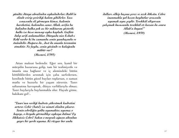 “ Tanrı ’ nın verdiği kudrete şükretmek kudretini artırır . Cebir ( batıl ) ise nimeti elinden çıkarır . Senin cebriliğin yolda uyumaktır , uyuma ; o kapıyı , o dergahı görmedikçe uykuya dalma ! Ey dikkatsiz Cebri ! Sakın o meyvalı ağacın altından gayrı bir yerde uyuma . Ki rüzgar her anda