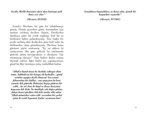 “ Allah ’ a hamd olsun bu dostluk , nihayet elimi tuttu . Sohbetlerin bir kimya idi herhalde ... gönül evinden ayağın eksik olmasın ! Sen cennet fidanından bir daldın ... ona yapıştım da beni cennete dek götürdü . Bedenimi kapıp götüren bir seldi ... bu sel , beni de lütuf ve ihsan denizinin kıyısına dek iletti . Su ümidiyle sele doğru gittim ; fakat denizi gördüm , kile kile inciler elde ettim . ‘ Allah müminleri satın aldı ’ sırrından bir şerbet içtim ki artık kıyamete kadar susamam ben !