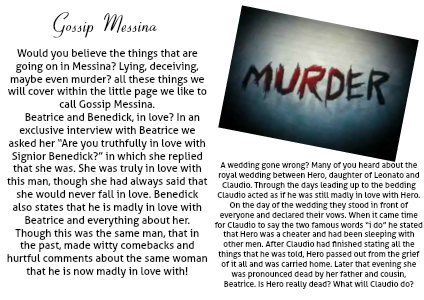 A wedding gone wrong? Many of you heard about the royal wedding between Hero, daughter of Leonato and Claudio. Through the days leading up to the bedding Claudio acted as if he was still madly in love with Hero. On the day of the wedding they stood in front of everyone and declared their vows. When it came time for Claudio to say the two famous words “i do” he stated that Hero was a cheater and had been sleeping with other men. After Claudio had finished stating all the things that he was told, Hero passed out from the grief of it all and was carried home. Later that evening she was pronounced dead by her father and cousin, Beatrice. Is Hero really dead? What will Claudio do? What will happen now? Find out in our next issue of Messina.