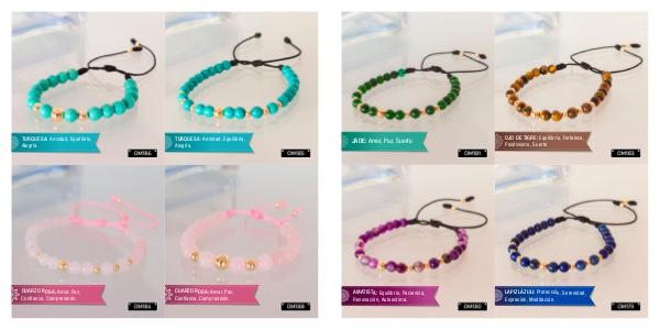 JADE: Amor, Paz, Suerte OJO DE TIGRE: Equilibrio, Fortaleza, Positivismo, Suerte AMATISTA: Equilibrio, Paciencia, Renovación, Autoestima. LAPIZLÁZULI: Protección, Serenidad, Expresión, Meditación.