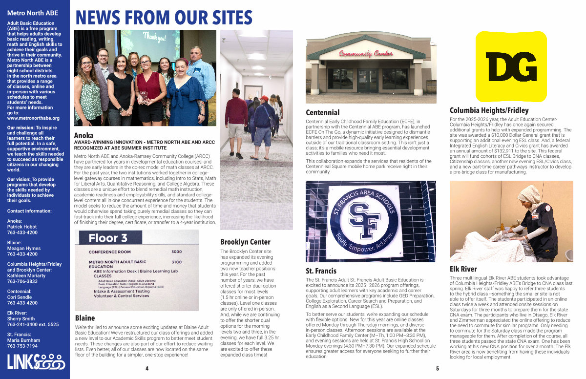For the 2025-2026 year, the Adult Education Center- Columbia Heights / Fridley has once again secured additional grants to help with expanded programming. The site was awarded a $ 10,000 Dollar General grant that is supporting an additional evening ESL class. And, a federal Integrated English Literacy and Civics grant has awarded an annual amount of $ 132,911 to the site. This federal grant will fund cohorts of ESL Bridge to CNA classes, Citizenship classes, another new evening ESL / Civics class, and a new part-time career pathways instructor to develop a pre-bridge class for manufacturing.