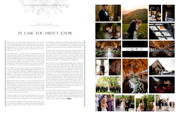 Music had woven its way through this relationship and it was important to Tom to have a live band . While Noel prefers a DJ because she enjoys hearing the original artist perform their own songs , Tom wanted his favorite band , Lost Wax , to play at the wedding . The newlyweds knew their first dance would be “ In Case You Didn ’ t Know ” by Brett Young . Tom had been working diligently behind the scenes to get the country music star to come sing this special song in person for them at their wedding . He kept it a secret and when the Lost Wax struck up the tune , the couple started to dance . But Tom pulled away from his bride , walking towards the microphone . Noel , not knowing what was happening , was worried Tom was going to sing . Instead he said , “ I love Lost Wax , but I love this woman more . So I want the original artist to sing this song for you ,“ and introduced Brett Young to the stage . Noel was completely caught off guard and shocked , yet when the couple danced together with Brett serenading them , it felt like it was just the two of them and the star-struck crowd melted away .