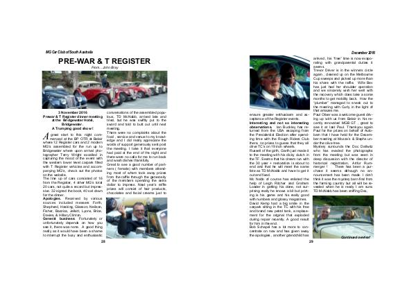 arrived, his“ free” time is now evaporating with grandparental duties it seems. Trevor Driver is in the winners circle again, cleaned up on the Melbourne Cup sweeps and picked up more than his share with the raffle. Wife Bev has just had her shoulder operation and we sincerely wish her well with the recovery which does take a some months to get mobility back. How the“ plumber” managed to sneak out to the meeting with Curly in the light of that amazes me. Paul Oliver was a welcome guest driving up with us from Belair in his recently renovated MGB GT, great to see it at last Paul. Thankyou again Paul for the prizes on behalf of Autobarn that I have held for the December meeting at Mozza’ s & Stephs under the olive tree. Mystery surrounds the Doc Dallwitz who has evaded the photographs from the meeting but was seen in deep discussion with the director of historical registration, Artfur Rummerger! There has been a purchase it seems although no announcement has been made. I don’ t think it was the mystery barn find from the farming country but all will be revealed when he is ready I am sure. TD McNabb has been sniffing Doc,