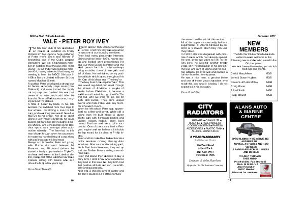 P eter died on 16th October at the age of 83. I met him 60 years ago when he was one of our founding members. Peter had many passionate interests: Elaine and his family, MG’ s, hourse racing and foorball were predominant. He was our third Social secretary and the ideal person for this position— always being sociable, cheerful, energetic and full of ideas. He maintained a very positive attitude which lasted throughout his life. One of his ideas was“ The Ivey” or“ The Ivey Fuel Consumption Test.” This was a well regulated pub crawl through the streets of Adelaide a couple of weeks before Christmas. It became a tradition and lasted through the 60s 70s and 80s until we were all too old for such wild events. They were unique events and memorable. Ask any member who went on one. When he left school Peter was apprenticed as a fitter and turner. While still a young man he built about a dozen sports cars with fibreglass bodies and usually Holden motors. They were named Bacchus and were quite successful. One of these cars had a Peugeot engine and we believe stills holds the lap record for its class at Phillip Island. Peter and his mate Rex Treloar became motor wreckers running Klemzig Auto Wreckers. After a second wrecking yard, North East Auto Wreckers, they set up and ran Trelive Motors selling secondhand cars. Peter and Elaine then decided to buy a dairy farm. I don’ t know what experience they had in this area but they both had that positive attitude and ran it scientifically and successfully. Next was a chicken farm at gawler and the same could be said of this venture.