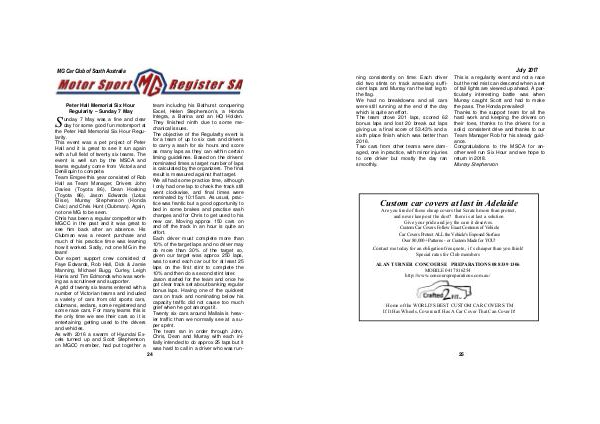 S day for some good fun motorsport at the Peter Hall Memorial Six Hour Regularity. This event was a pet project of Peter Hall and it is great to see it run again with a full field of twenty six teams. The event is well run by the MSCA and teams regularly come from Victoria and Deniliquin to compete. Team Emgee this year consisted of Rob Hall as Team Manager, Drivers John Davies( Toyota 86), Dean Hosking( Toyota 86), Jason Edwards( Lotus Elise), Murray Stephenson( Honda Civic) and Chris Hunt( Clubman). Again, not one MG to be seen. Chris has been a regular competitor with MGCC in the past and it was great to see him back after an absence. His Clubman was a recent purchase and much of his practice time was learning how it worked. Sadly, not one MG in the team! Our expert support crew consisted of Faye Edwards, Rob Hall, Dick & Jamie Manning, Michael Bugg, Curley, Leigh Harris and Tim Edmonds who was working as a scrutineer and supporter. A grid of twenty six teams entered with a number of Victorian teams and included a variety of cars from old sports cars, clubmans, sedans, some registered and some race cars. For many teams this is the only time we see their cars so it is entertaining getting used to the drivers and vehicles. As with 2016 a swarm of Hyundai Excels turned up and Scott Stephenson, an MGCC member, had put together a team including his Bathurst conquering Excel, Helen Stephenson’ s, a Honda Integra, a Barina and an HQ Holden. They finished ninth due to some mechanical issues. The objective of the Regularity event is for a team of up to six cars and drivers to carry a sash for six hours and score as many laps as they can within certain timing guidelines. Based on the drivers’ nominated times a target number of laps is calculated by the organizers. The final result is measured against that target. We all had some practice time, although I only had one lap to check the track still went clockwise, and final times were nominated by 10:15am. As usual, practice was frantic but a good opportunity to bed in some brakes and practise sash changes and for Chris to get used to his new car. Moving approx 150 cars on and off the track in an hour is quite an effort. Each driver must complete more than 10 % of the target laps and no driver may do more than 30 % of the target so, given our target was approx 250 laps, was to send each car out for at least 25 laps on the first stint to complete the 10 % and then do a second stint later. Jason started for the team and once he got clear track set about banking regular bonus laps. Having one of the quickest cars on track and nominating below his capacity traffic did not cause too much grief when he got amongst it. Twenty six cars around Mallala is heavier traffic than we normally see at a super sprint. The team ran in order through John, Chris, Dean and Murray with each initially intended to do approx 25 laps but it was hard to call in a driver who was run-