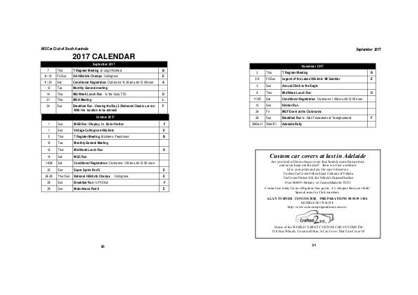3 Sun Annual Climb to the Eagle 9 Thur Mid Week Lunch Run 11/25 Sat Conditional Registration Clubrooms 1.00am until 12.00 noon 12 Sun Kimber Run 24 Fri MGF Event at the Clubrooms 26 Sun Breakfast Run to Alan Fowerakers at Younghusband Wed/Fri Adelaide Rally