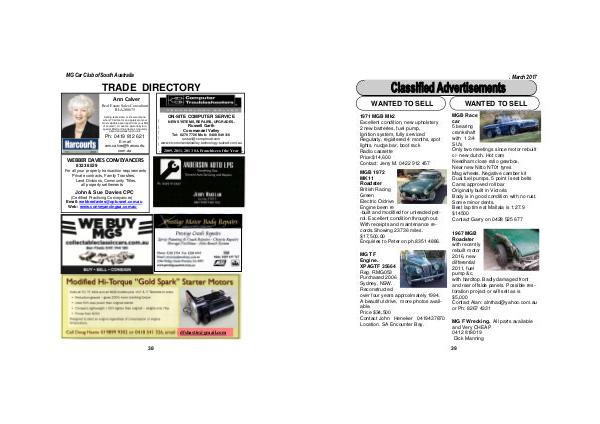 1971 MGB Mk2 Excellent condition, new upholstery 2 new batteries, fuel pump, Ignition system, fully serviced Regularly, registered 4 months, spot lights, nudge bar, boot rack Radio cassette Price:$ 14,600 Contact: Jerry M. 0422 912 457