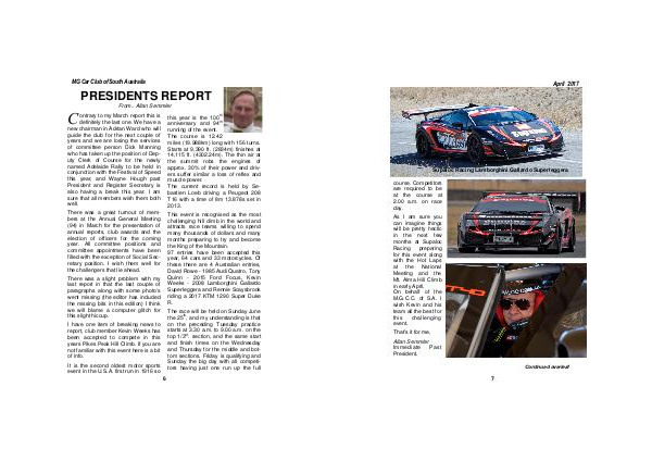 C definitely the last one. We have a new chairman in Adrian Ward who will guide the club for the next couple of years and we are losing the services of committee person Dick Manning who has taken up the position of Deputy Clerk of Course for the newly named Adelaide Rally to be held in conjunction with the Festival of Speed this year, and Wayne Hough past President and Register Secretary is also having a break this year. I am sure that all members wish them both well.