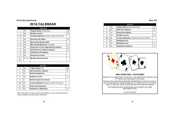 8 Tue Monthly General Meeting 10 Thur Mid Week Lunch Run . 12/26 Sat Conditional Registration Clubrooms 1.00am until 12.00 noon 13 Sun MGB Register event 17 Thur MGA Register Event L