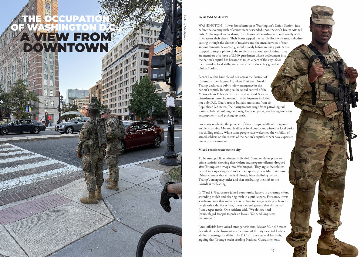 WASHINGTON – It was late afternoon at Washington’ s Union Station, just before the evening rush of commuters descended upon the city’ s Beaux-Arts rail hub. At the top of an escalator, three National Guardsmen stood casually with rifles across their chests. Their boots tapped the marble floor with steady rhythm, cutting through the chatter of travelers and the metallic voice of train announcements. A woman glanced quickly before moving past. A man stopped to snap a photo of the soldiers in camouflage clothing. They are members of a force of 2,300 guardsmen whose deployment into the nation’ s capital has become as much a part of the city life as the turnstiles, food stalls, and crowded corridors they guard at Union Station.