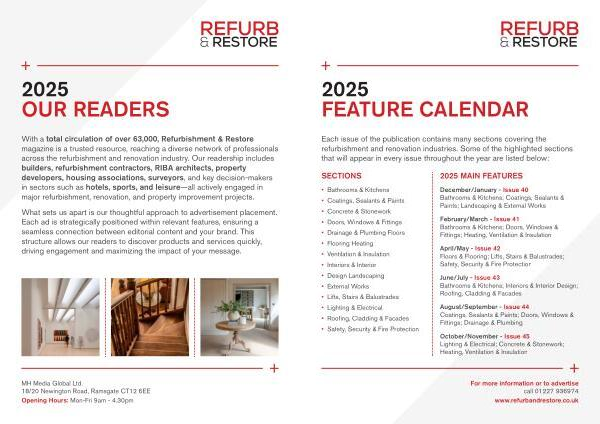 With a total circulation of over 63,000 , Refurbishment & Restore magazine is a trusted resource , reaching a diverse network of professionals across the refurbishment and renovation industry . Our readership includes builders , refurbishment contractors , RIBA architects , property developers , housing associations , surveyors , and key decision-makers in sectors such as hotels , sports , and leisure — all actively engaged in major refurbishment , renovation , and property improvement projects .