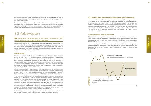 Historiene og øvelsene i håndboken kan brukes til å styrke og stabilisere den utsatte , hjelpe han til å føle seg mer i kontroll og bli mindre redd . Gjennom å formidle kunnskap kan hjelperen støtte den utsatte til å forstå sine egne reaksjoner . Hjelperen kan gi den utsatte noen verktøy som kan hjelpe han , i form av øvelser som han kan gjøre for å roe seg ned , selv når han er stresset og opplever flashbacks . Slike øvelser kan være effektive verktøy som kan brukes i situasjoner der det er få ressurser , eller der terapeutisk støtte ikke er tilgjengelig . Det er også viktig at den utsatte blir klar over og tar i bruk sine egne ressurser , og får en bedre oversikt over sine rettigheter . Gjennom disse stegene kan utsatte gjenvinne kontroll i sine liv .