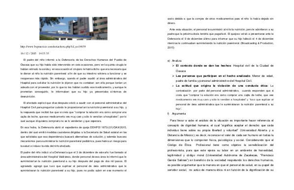 El padre del niño informó a la Defensoría de los Derechos Humanos del Pueblo de Oaxaca que su hijo había sido intervenido en seis ocasiones, pero en la quinta cirugía le habían retirado la sonda y en esa ocasión el cirujano le había dicho que era necesario que le dieran al niño la nutrición parenteral a fin de que su intestino volviera a funcionar y se recuperase más rápido. Sin embargo, cuando el padre acudió al área administrativa del Hospital para solicitar la nutrición le dijeron que no contaban con ella porque tenían un adeudo con el proveedor, por lo que no les habían surtido ese medicamento, y aunque le prometían conseguirlo, le informaban que su hijo ya presentaba síntomas de desnutrición.