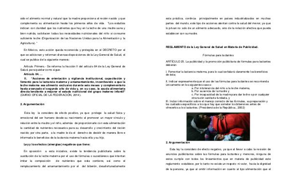 Esta ley la considero de efecto negativo, ya que al llevar a cabo la revisión de anuncios publicitarios sobre las fórmulas para lactantes y menores, ninguna de estos cumple con todos los lineamientos que en materia de publicidad este reglamento establece, por lo tanto no existe un respeto ni valor, hacia la dignidad de la persona, ya que al omitir información en cuanto al tipo alimentación que el