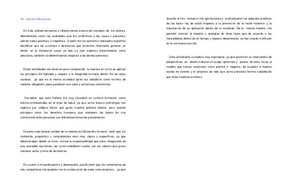 Durante esta tercera unidad de la materia de Desarrollo humano, sentí que los contenido, propósitos y competencias eran muy claros y específicos, ya que determinaban desde un inicio revisar la responsabilidad que como integrantes de una sociedad asumimos, así como establecer cuáles son los valores que guían nuestros actos y toma de decisiones.